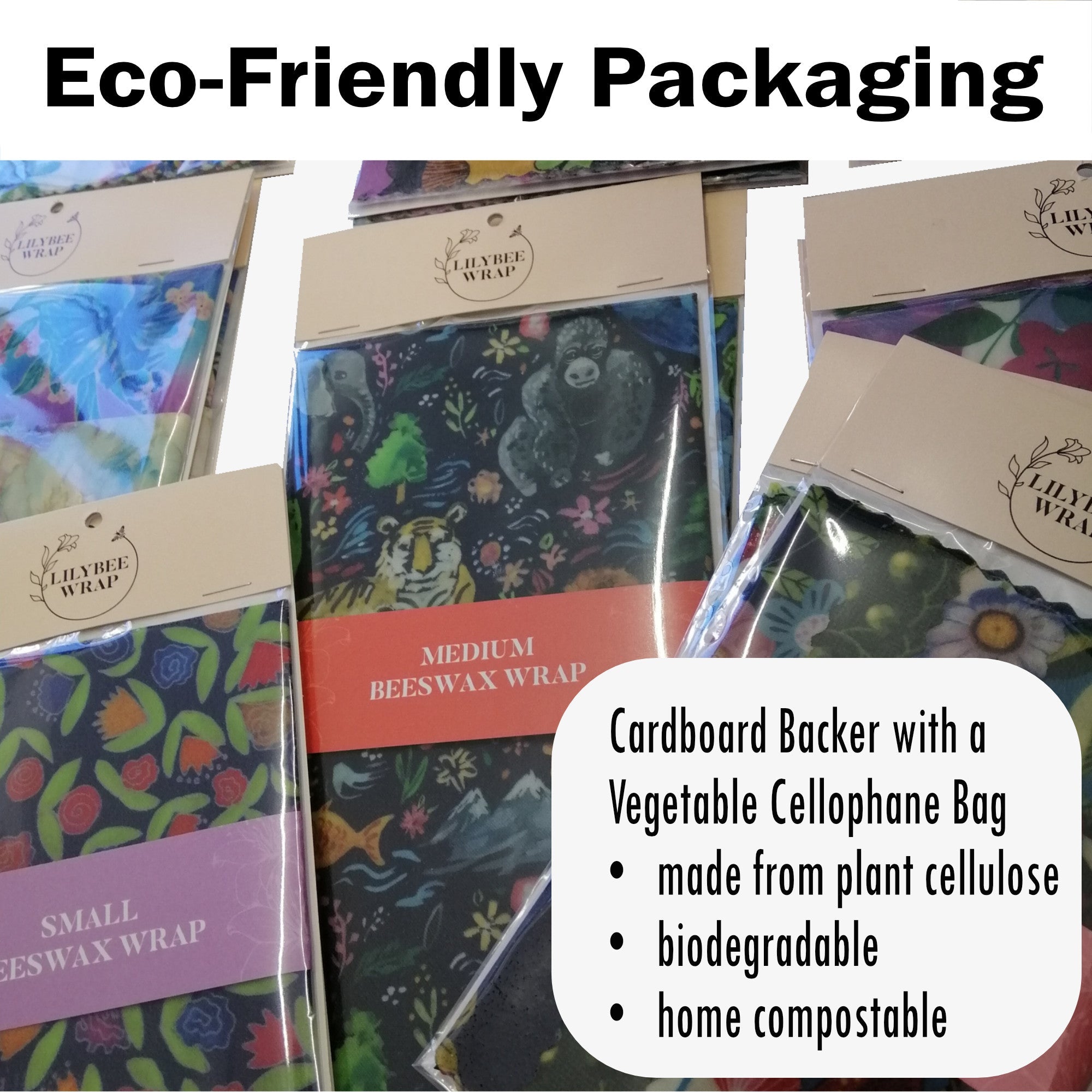However, if you’re purchasing wraps as a gift, our eco-friendly packaging might be just what you need. Each wrap is enclosed in a clear bag that looks like plastic but is actually made from vegetable cellulose—a fully biodegradable and home-compostable material. This packaging not only keeps your wraps clean and hygienic but also allows the beautiful design to shine through.